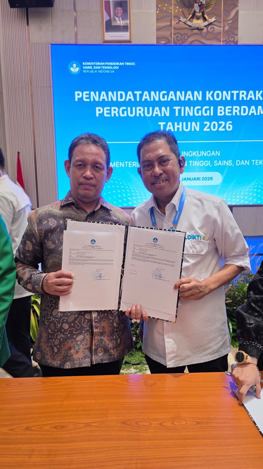 BERITASEMBILAN.Com-Makassar. Rektor Universitas Muhammadiyah (Unismuh) Makassar, Dr Abd Rakhim Nanda, didampingi Wakil Rektor I Prof Andi Sukri Syamsuri, menghadiri penandatanganan Kontrak Kinerja dan Arahan Kinerja Perguruan Tinggi Berdampak Tahun 2026 yang digelar Kementerian Pendidikan Tinggi, Sains, dan Teknologi (Kemendiktisaintek), Senin, 5 Januari 2026.