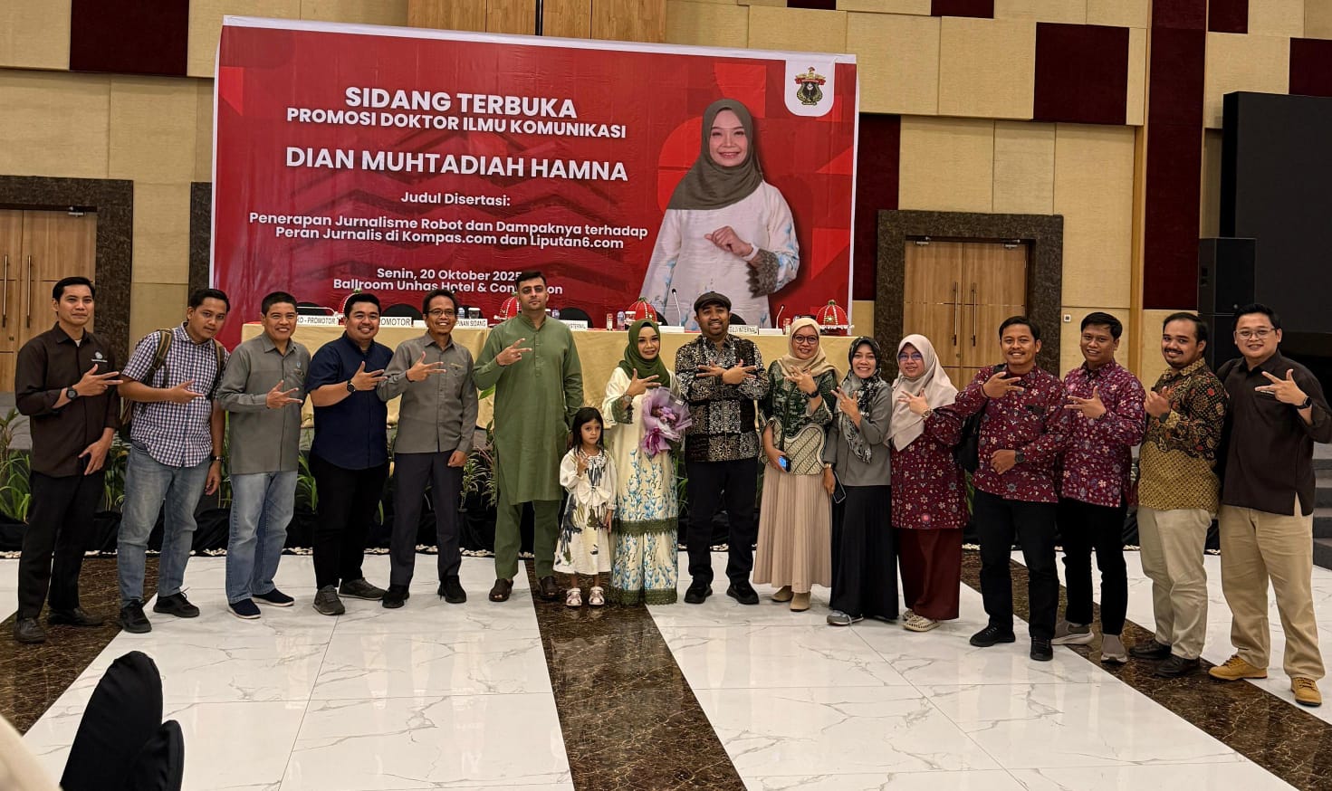 Sidang ujian promosi dipimpin oleh Dekan FISIP Unhas, Prof. Dr. Phil. Sukri, M.Si., Dian mempresentasikan disertasi berjudul “Penerapan Jurnalisme Robot dan Dampaknya terhadap Peran Jurnalis di Kompas.com dan Liputan6.com.”