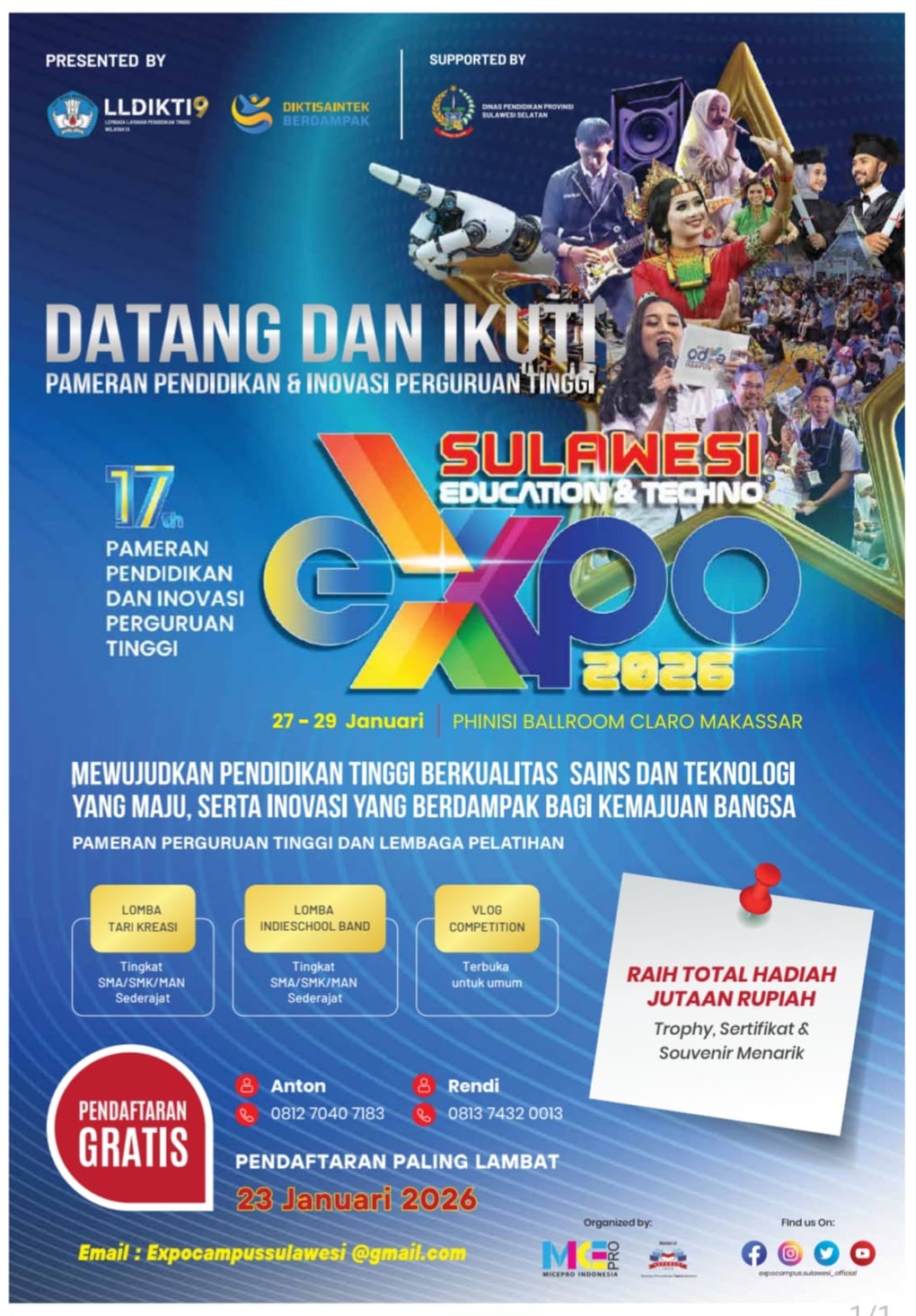 BERITASEMBILAN.Com-Makassar. Sulawesi Education & Techno Expo (SETE) 2026 akan digelar di Phinisi Ballroom Claro Makassar pada 27–29 Januari 2026. Kegiatan ini mengusung tema “Mewujudkan Pendidikan Tinggi Berkualitas Sains dan Teknologi yang Maju, serta Inovasi yang Berdampak bagi Kemajuan Bangsa.”