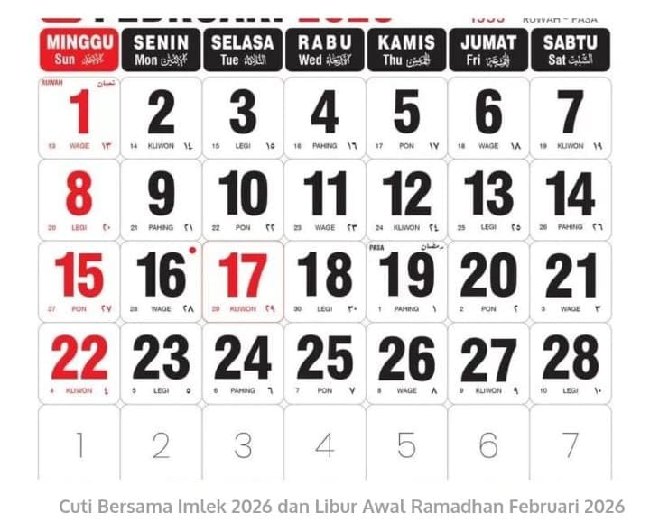 Catatan: Libur awal Ramadhan 2026 berdekatan dengan libur nasional dan cuti bersama Tahun Baru Imlek 2577 Kongzili, yaitu: