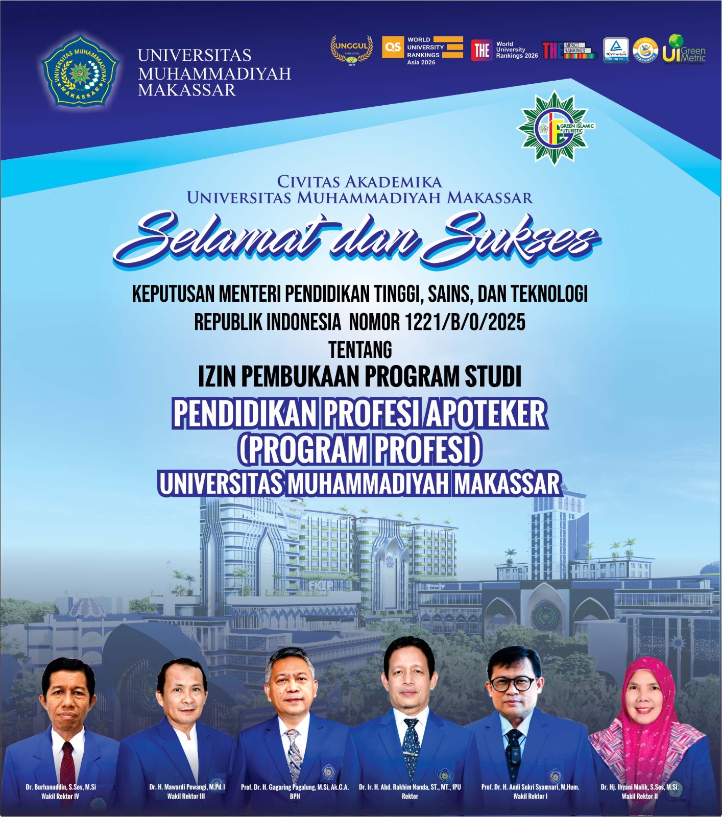 BERITASEMBILAN.Com-MAKASSAR. Universitas Muhammadiyah (Unismuh) Makassar resmi mengantongi izin pembukaan Program Studi Pendidikan Profesi Apoteker (PSPA) Program Profesi. Izin tersebut tertuang dalam Keputusan Menteri Pendidikan Tinggi, Sains, dan Teknologi (Kemdiktisaintek) Nomor 1221/B/O/2025 yang ditetapkan di Jakarta pada 30 Desember 2025.