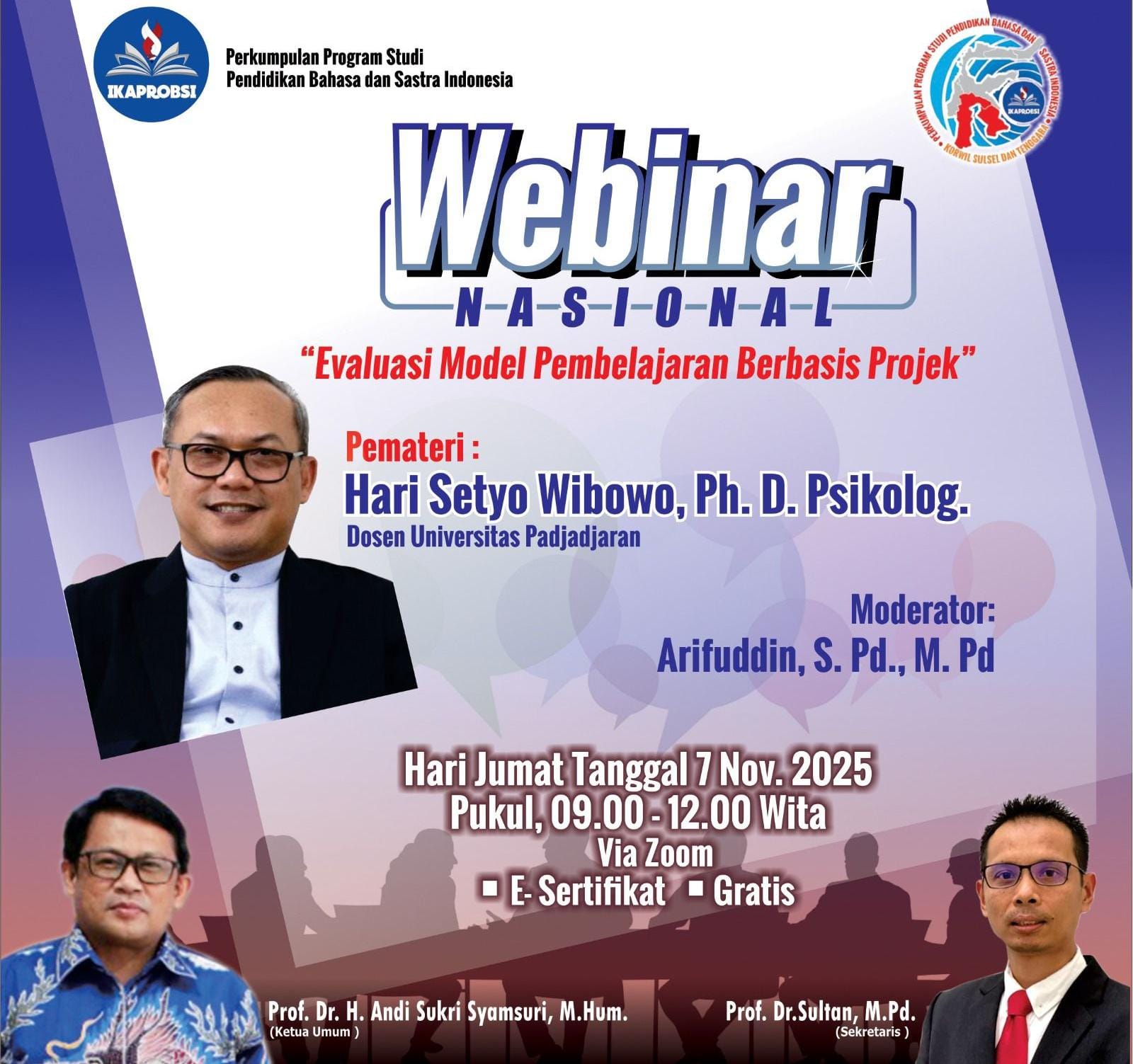 BERITASEMBILAN.Com-Makassar. Pengurus Wilayah Ikatan Program Studi Pendidikan Bahasa dan Sastra Indonesia (IKAPROBSI) Sulsel dan Sultra, menggelar webinar nasional dengan tema, Ebaluasi Model Pembelajaran Berbasis Proyek, Jumat 7 Nopember 2025 dengan menghadirkan nara sumber, dosen Universitas Padjajaran, Hari Setyo Wibowo, P.Hd.Psikolog.