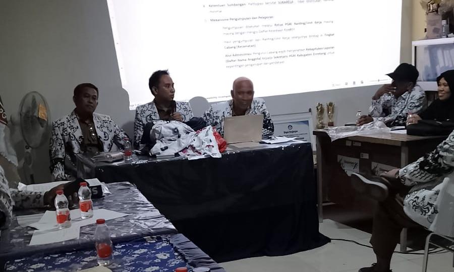 Rapat dipimpin Wakil Ketua PGRI Enrekang, Dr Dadang Sumarna, S.Pd., M.Pd., bersama A Suhardiman, S.Pd., M.Pd., dan dihadiri jajaran pengurus mulai tingkat kabupaten, cabang hingga ranting.