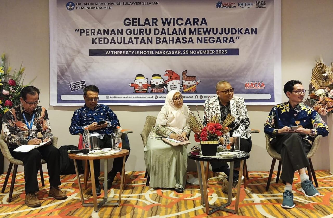 BERITASEMBILAN.Com-Makassar. Upaya memperkuat kedaulatan Bahasa Indonesia sebagai bahasa negara kembali mendapat sorotan serius dalam kegiatan Gelar Wicara Peran Guru dalam Mewujudkan Bahasa Negara yang diselenggarakan oleh Balai Bahasa Provinsi Sulawesi Selatan di W Three Style Hotel Makassar, Sabtu (29/11/2025).