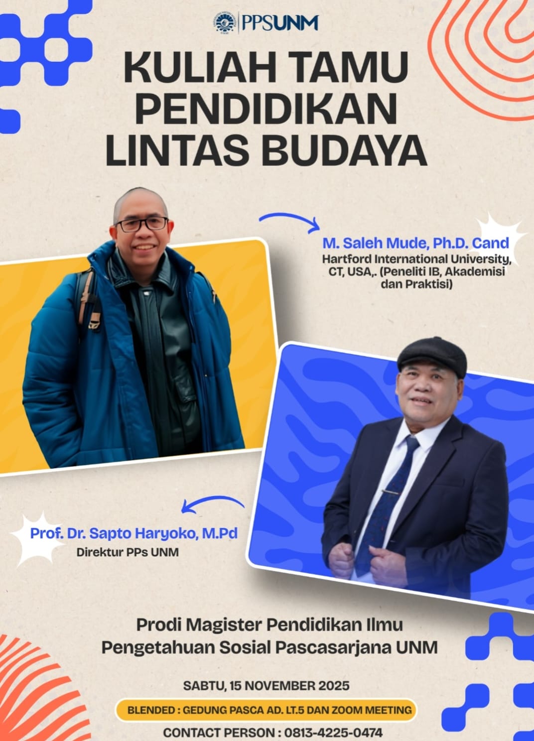 BERITASEMBILAN.Com-Makassar — Program Studi Magister Pendidikan IPS Pascasarjana Universitas Negeri Makassar (UNM) menggelar kuliah tamu bertema “Pendidikan Lintas Budaya dalam Konteks Modern” secara hybrid pada Sabtu, 15 November 2025. Kegiatan ini menghadirkan narasumber utama, M. Saleh Mude, Ph.D. Cand, mahasiswa dari Hartford International University, Connecticut, Amerika Serikat, yang juga dikenal sebagai akademisi dan praktisi di bidang kajian budaya dan pluralisme.