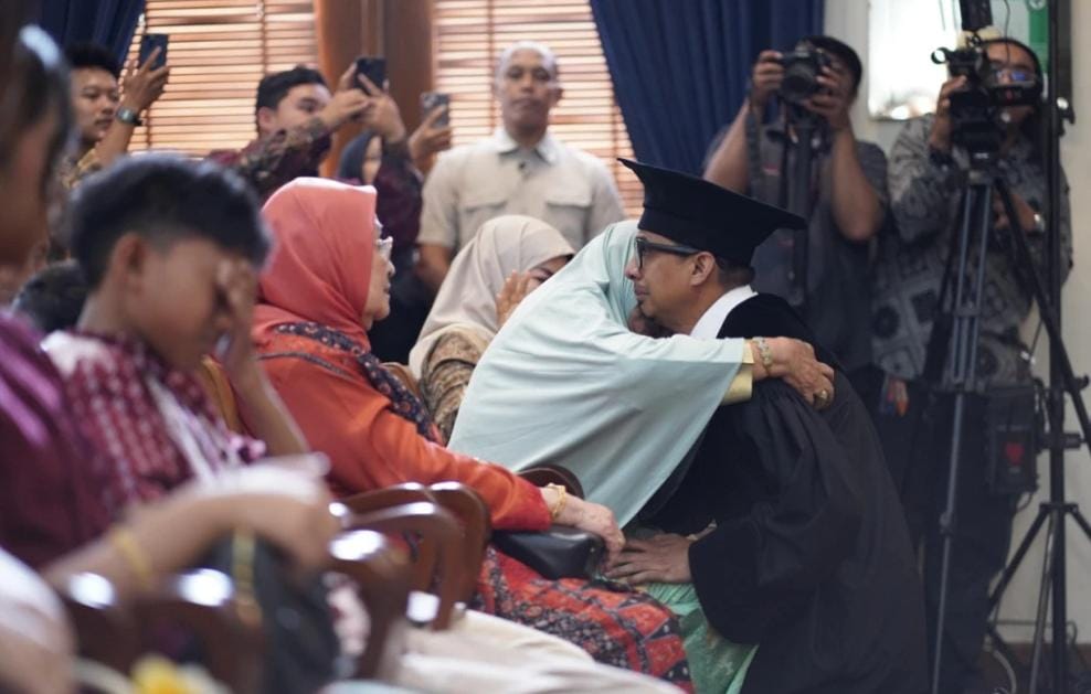 Uceng tak kuasa menahan air mata saat mengenang pesan ayahandanya yang telah berpulang. Ia terdiam sejenak, menyeka wajahnya, larut dalam kesedihan karena sosok yang selama ini menjadi sumber semangat hidupnya tak sempat menyaksikan capaian akademik tertinggi itu diraih.
