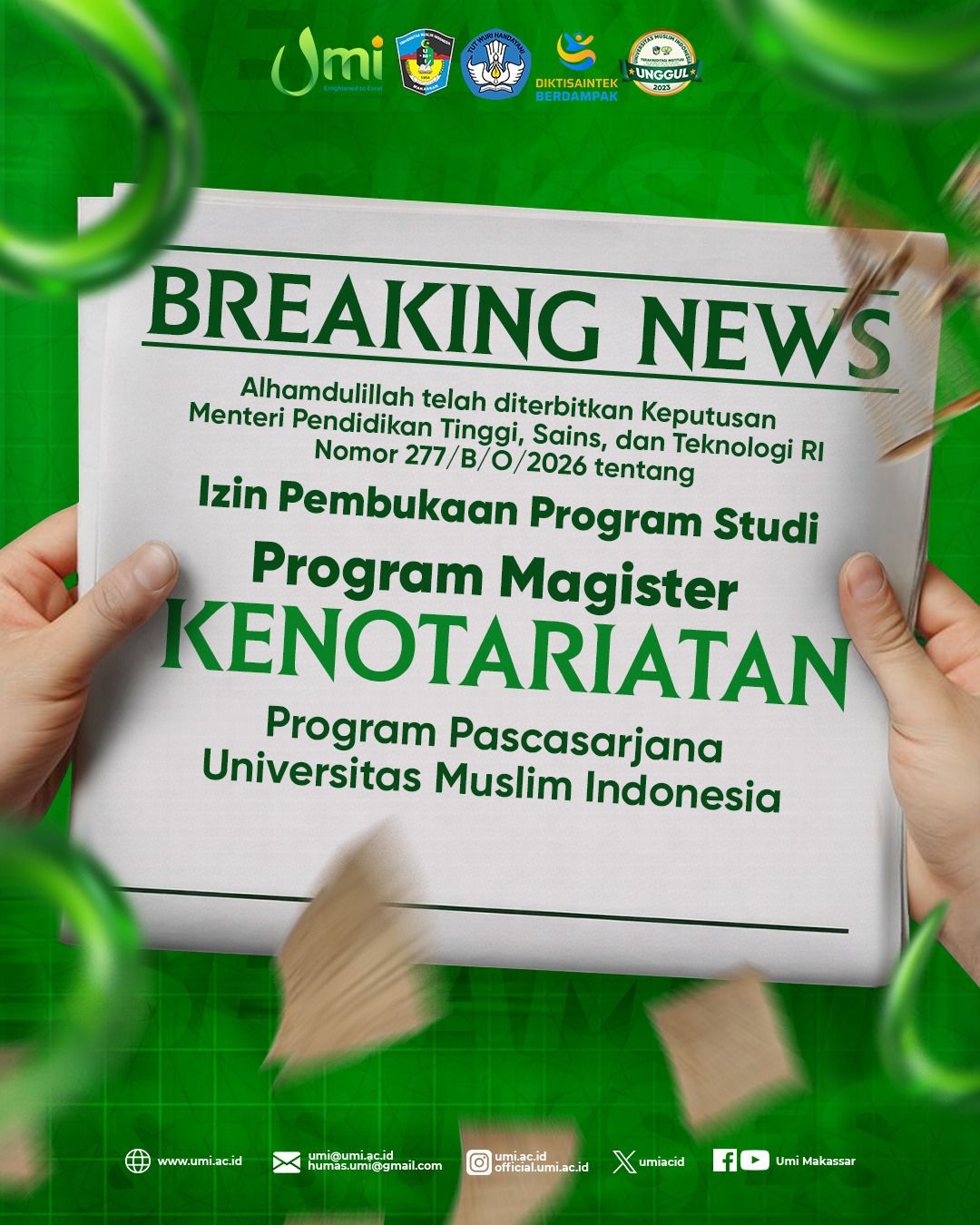 BERITASEMBILAN.Com-Makassar. Universitas Muslim Indonesia (UMI) kembali mendapat kepercayaan besar dari negara dengan diterbitkannya Keputusan Menteri Pendidikan Tinggi, Sains, dan Teknologi Republik Indonesia Nomor 277/B/O/2026 yang mengizinkan pembukaan Program Studi Kenotariatan pada jenjang Magister di UMI. Keputusan ini menjadi tonggak penting dalam pengembangan pendidikan hukum di UMI, yang kini siap menjawab tantangan kebutuhan profesi notaris di Indonesia.
