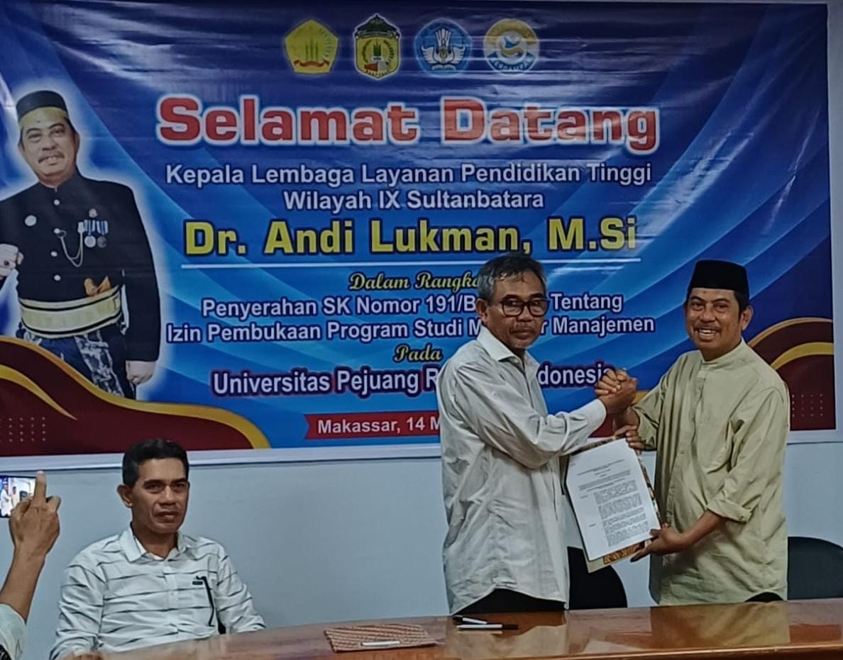 BERITASEMBILAN.Com-Makassar. Universitas Pejuang Republik Indonesia (UPRI) kembali mencatatkan prestasi penting setelah menerima Surat Keputusan (SK) Izin Pembukaan Program Studi Magister Manajemen dari Kepala LLDIKTI IX, Dr. Andi Lukman, M.Si, pada Jumat 13 Maret 2026.